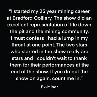 A theatre piece commemorating and celebrating the history of Bradford pit and the people that contributed to its story. Be transported back to the mines as we share real life interviews of those that worked the mines alongside projection and live theatre.